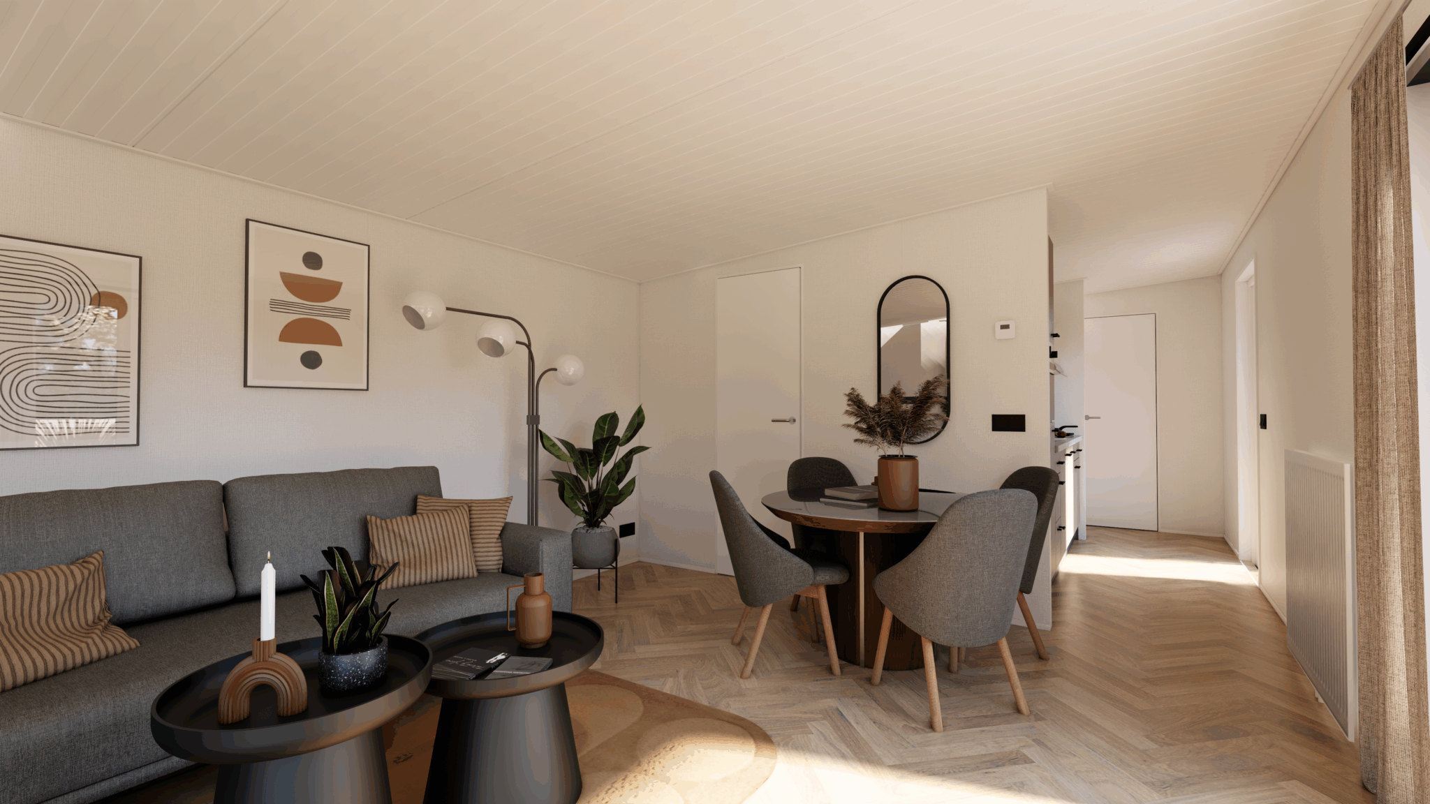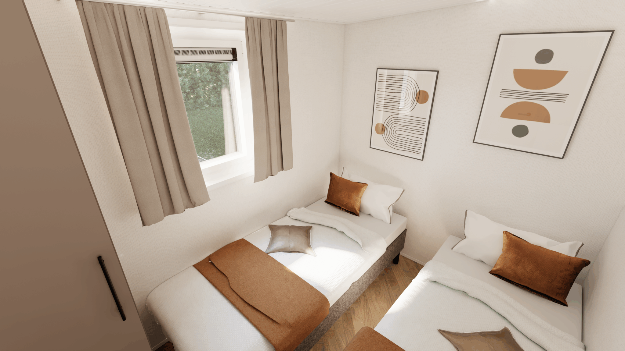 Pavillon Horizon – Mit einer Fläche von ca. 45 m² ist er perfekt für 4 Personen und bietet allen Komfort und Platz, den Sie sich wünschen. Das Pavillon Horizon verfügt über zwei geräumige Schlafzimmer und ein luxuriöses Badezimmer mit Dusche. Die trendige Küche ist mit einem Geschirrspüler und einer Kombi-Mikrowelle ausgestattet, sodass Sie im Handumdrehen köstliche Mahlzeiten zubereiten können. Bodenbeläge und Polster sind im Preis inbegriffen, sodass Sie sofort mit der Einrichtung Ihres neuen Zuhauses beginnen können. Außerdem sind Stauschränke und Kleiderschränke vorhanden, sodass Sie sofort über ausreichend Stauraum verfügen.