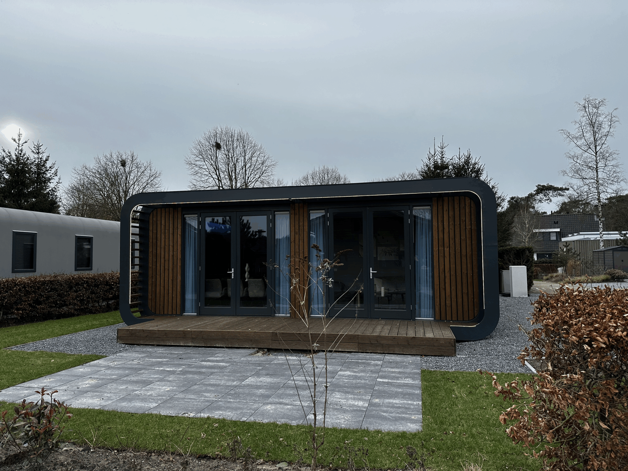 Modus 4 - Het trendy exterieur van de Modus 4 doet u verrassen en geeft een unieke indruk van de nieuwste generatie van recreatiewoningen. De ronde vormen zijn aantrekkelijk in het ontwerp verwerkt en geven echt het ‘wauw’ gevoel. De woonkamer heeft een grote glaspartij waarmee u prachtig uitzicht hebt. Aangrenzend is de masterbedroom waar het heerlijk vertoeven is.