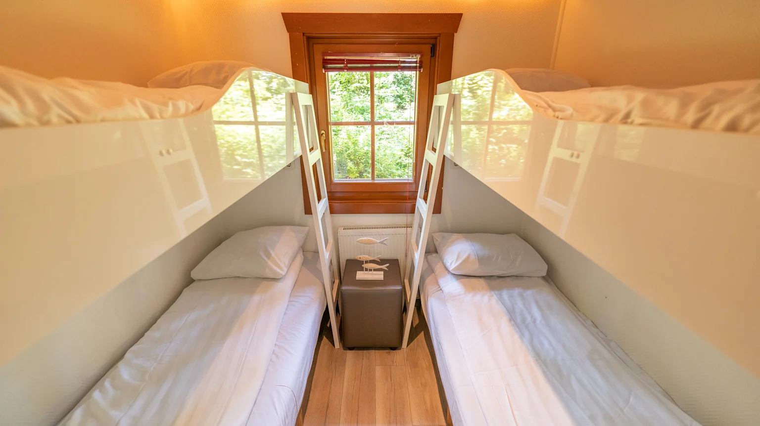 Binnen vindt u een woonkamer met zithoek en een aparte eethoek. De open keuken is uitgerust met een vaatwasser, waterkoker, combimagnetron en koffiezetapparaat. In alle slaapkamers staan 2 eenpersoonsbedden. Verder is er een badkamer met een douche, toilet en wastafel.