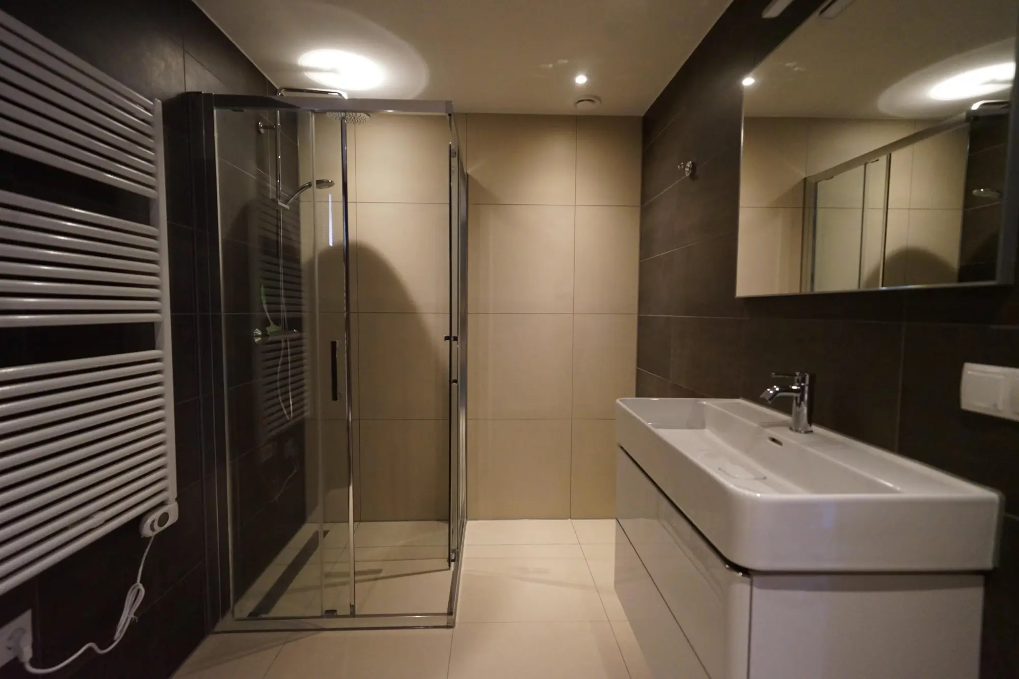 Im Erdgeschoss befindet sich außerdem ein Schlafzimmer, das geräumige Badezimmer mit begehbarer Dusche, Doppelwaschbecken, hängender Toilette und Waschbecken sowie eine separate Toilette.