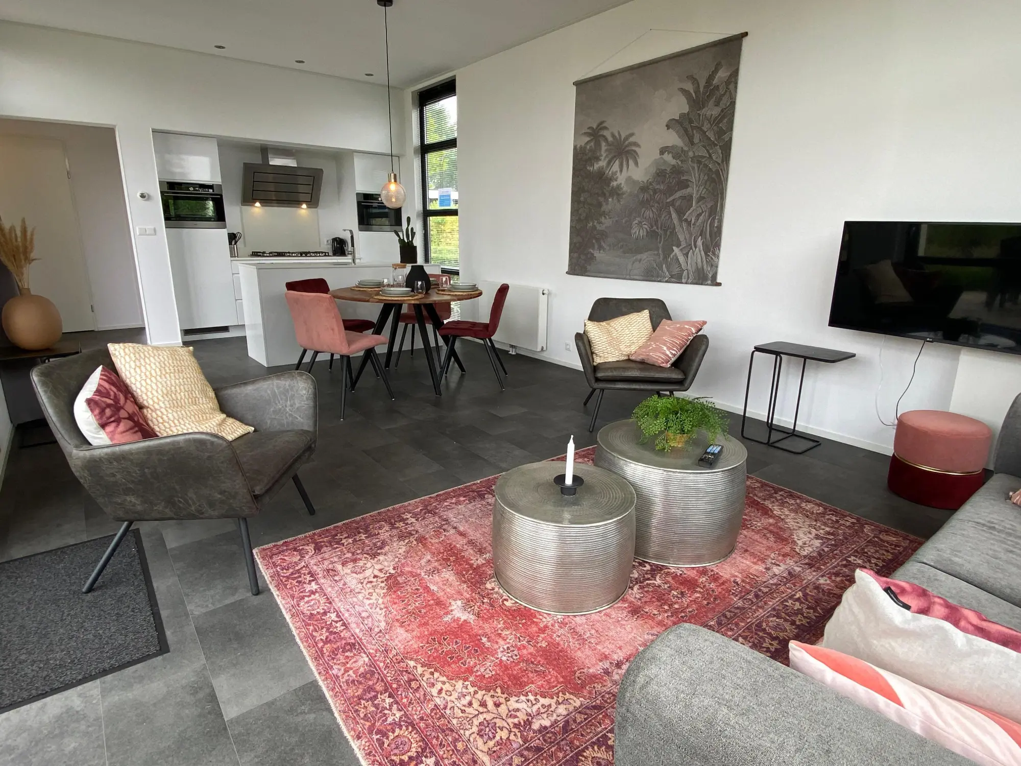 Die beiden Schlafzimmer sind mit jeweils 2 Betten ausgestattet. Im Badezimmer gibt es eine Dusche, eine Toilette und ein Waschbecken. Das geräumige Wohnzimmer mit der voll ausgestatteten offenen Küche vermittelt eine gemütliche Atmosphäre, in der man sich sofort wohlfühlt. Auch die große Terrasse trägt dazu bei. In Kombination mit den großen Fenstern verbindet sie den Innen- und Außenbereich des Ferienhauses.