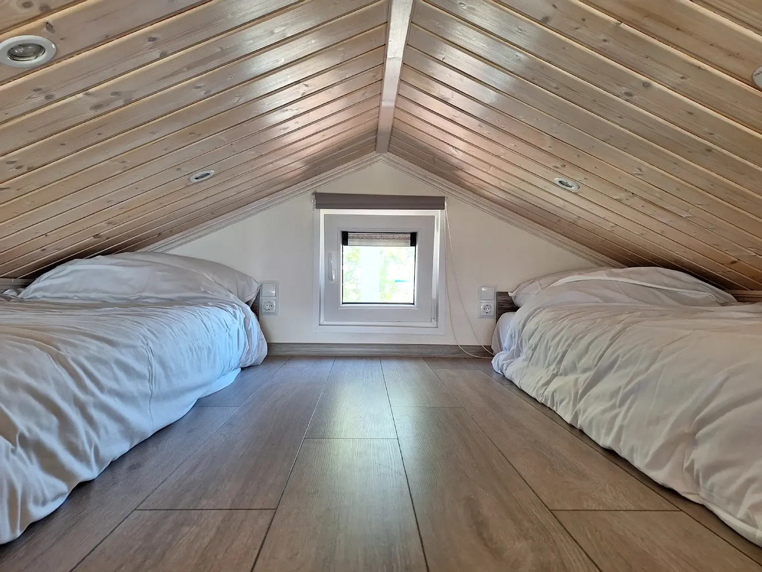 Lodge 4 - Der Type 'Lodge' eignet sich für vier Personen. Dieses gemütliche Ferienhaus hat eine Glasfassade, die Ihnen einen tollen Rundum-Blick bietet. Im Erdgeschoss befinden sich eine offene Küchenecke, ein Badezimmer und ein Schlafzimmer. Vom Wohnzimmer aus gelangen Sie in das zweite Schlafzimmer auf dem Dachboden.