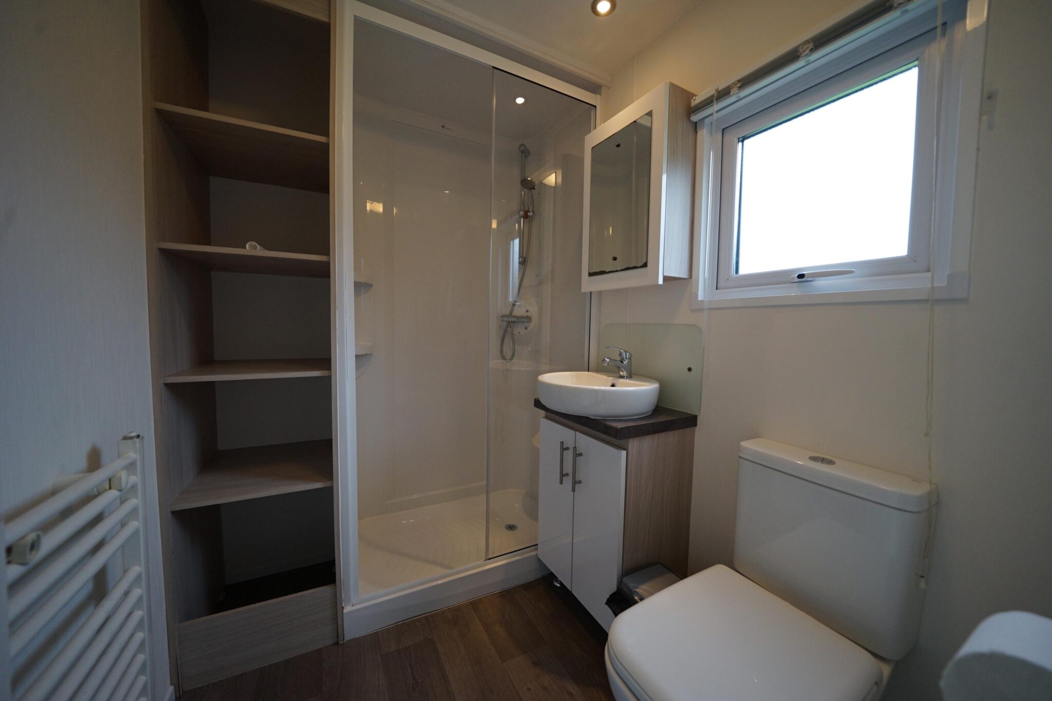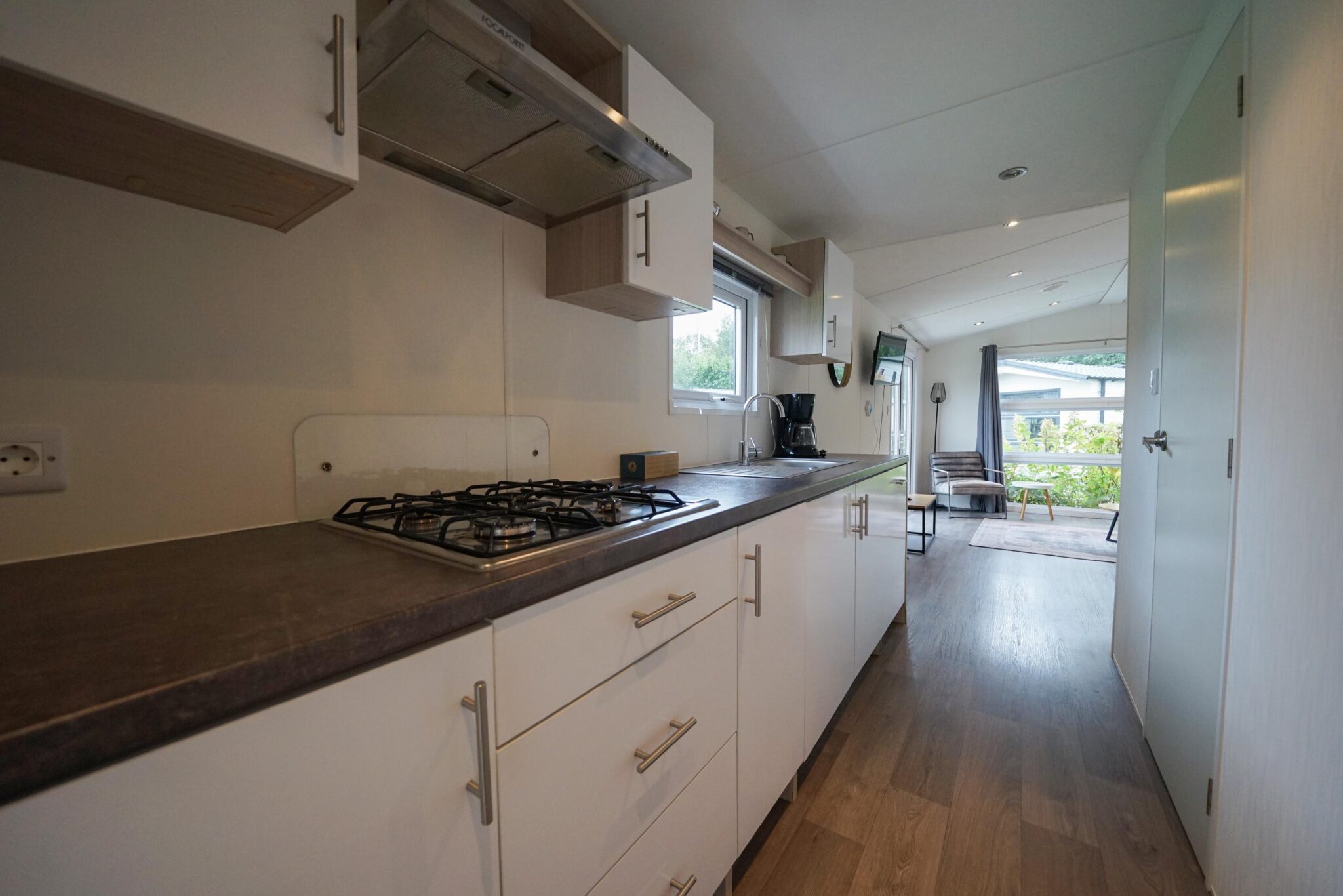 Der Wohnbereich ist mit großen Fenstern ausgestattet. Die Küche ist komplett eingerichtet und verfügt über einen Backofen, eine Kombimikrowelle, einen Geschirrspüler, ein Induktionskochfeld und eine Kühl-Gefrierkombination. Durch das Wohnzimmer betreten Sie den Flur, von dem aus Sie Zugang zu den beiden Schlafzimmern und dem Badezimmer haben. Zum Ferienhaus gehört ein Garten mit Terrasse.